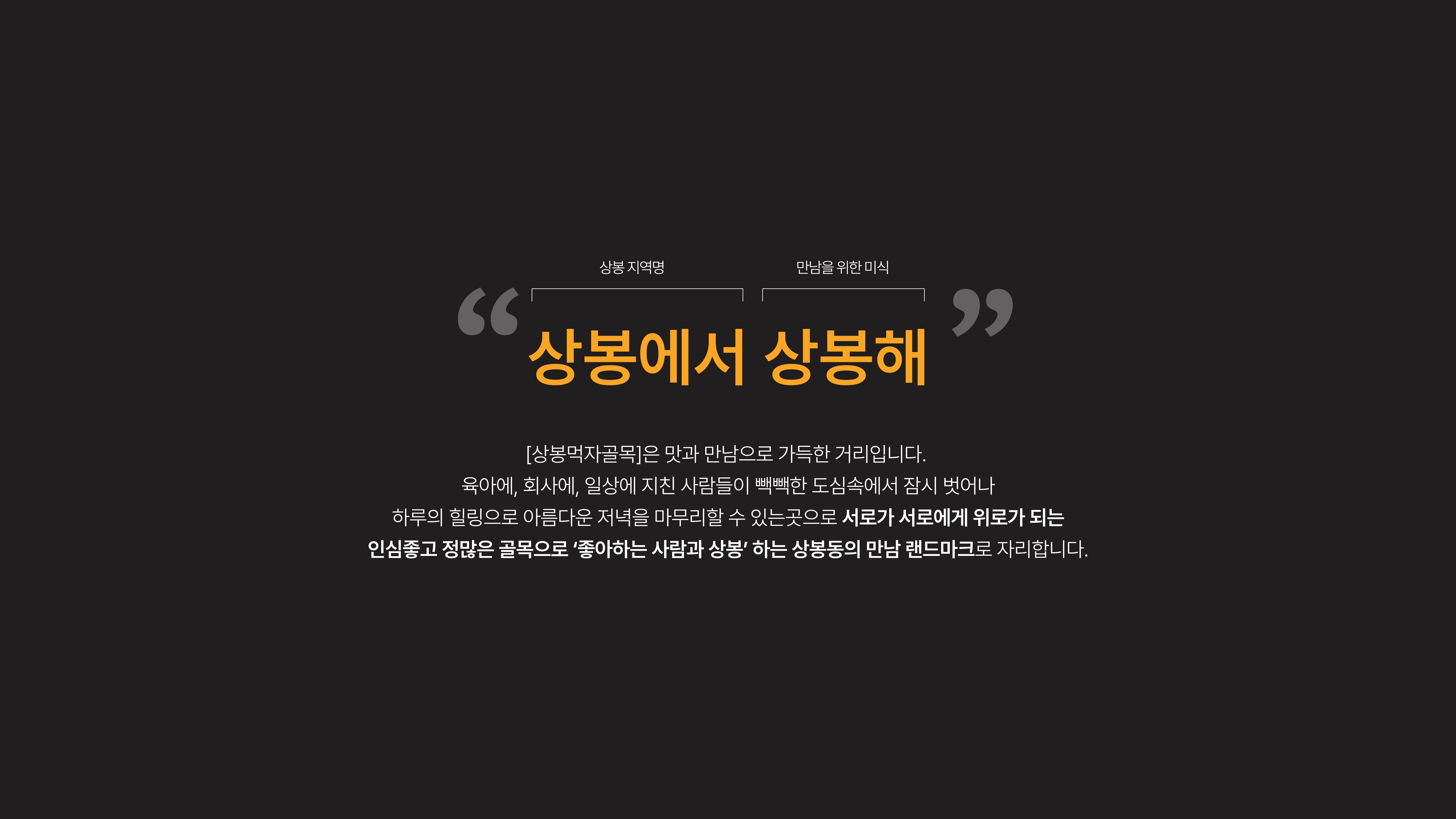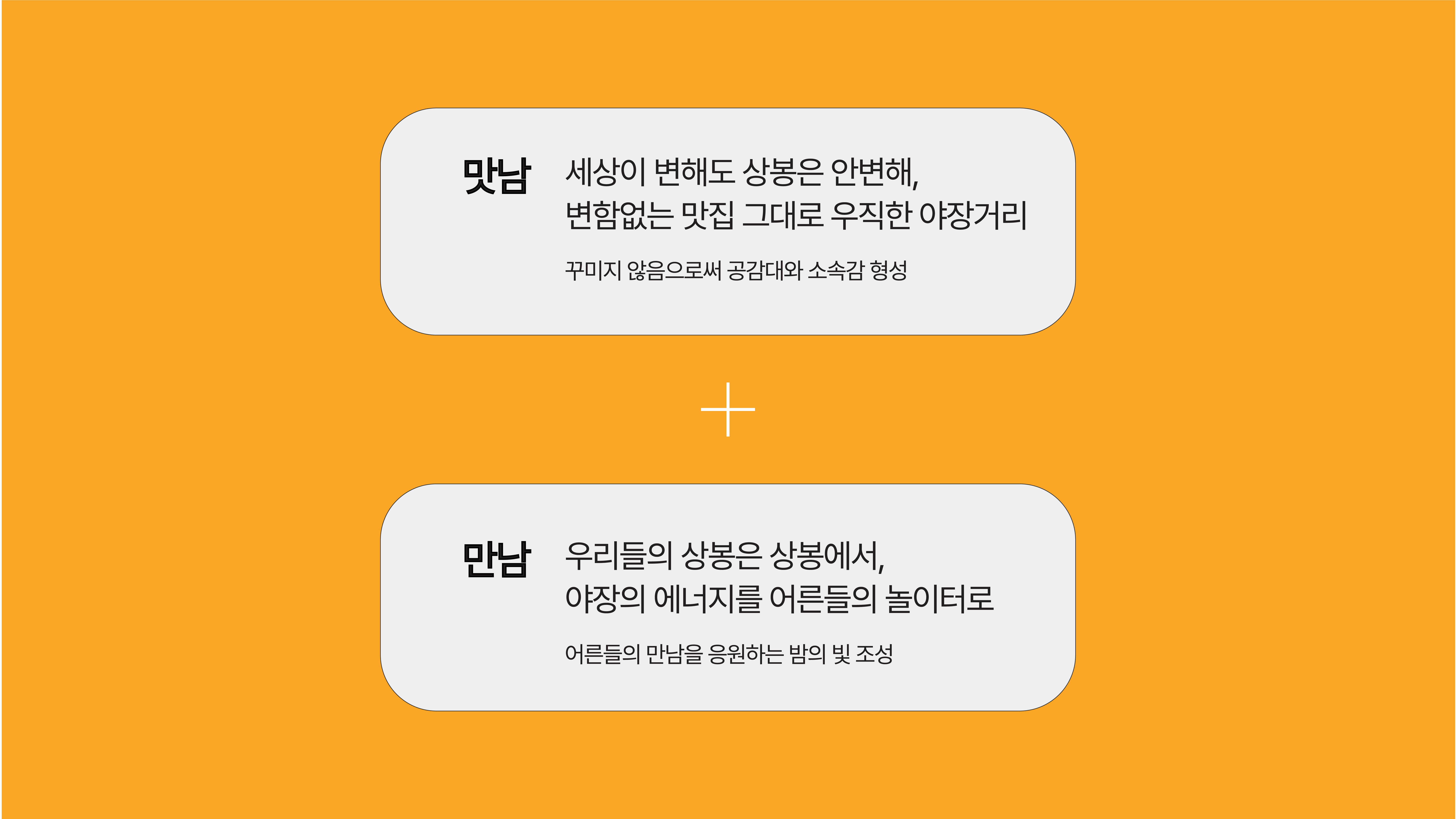 보통 브랜딩은 약점을 찾아 보완하는 방향으로 가지만, 상봉먹자골목은 이미 가진 강점(야장, 미식, 만남)이 너무 명확했어요.