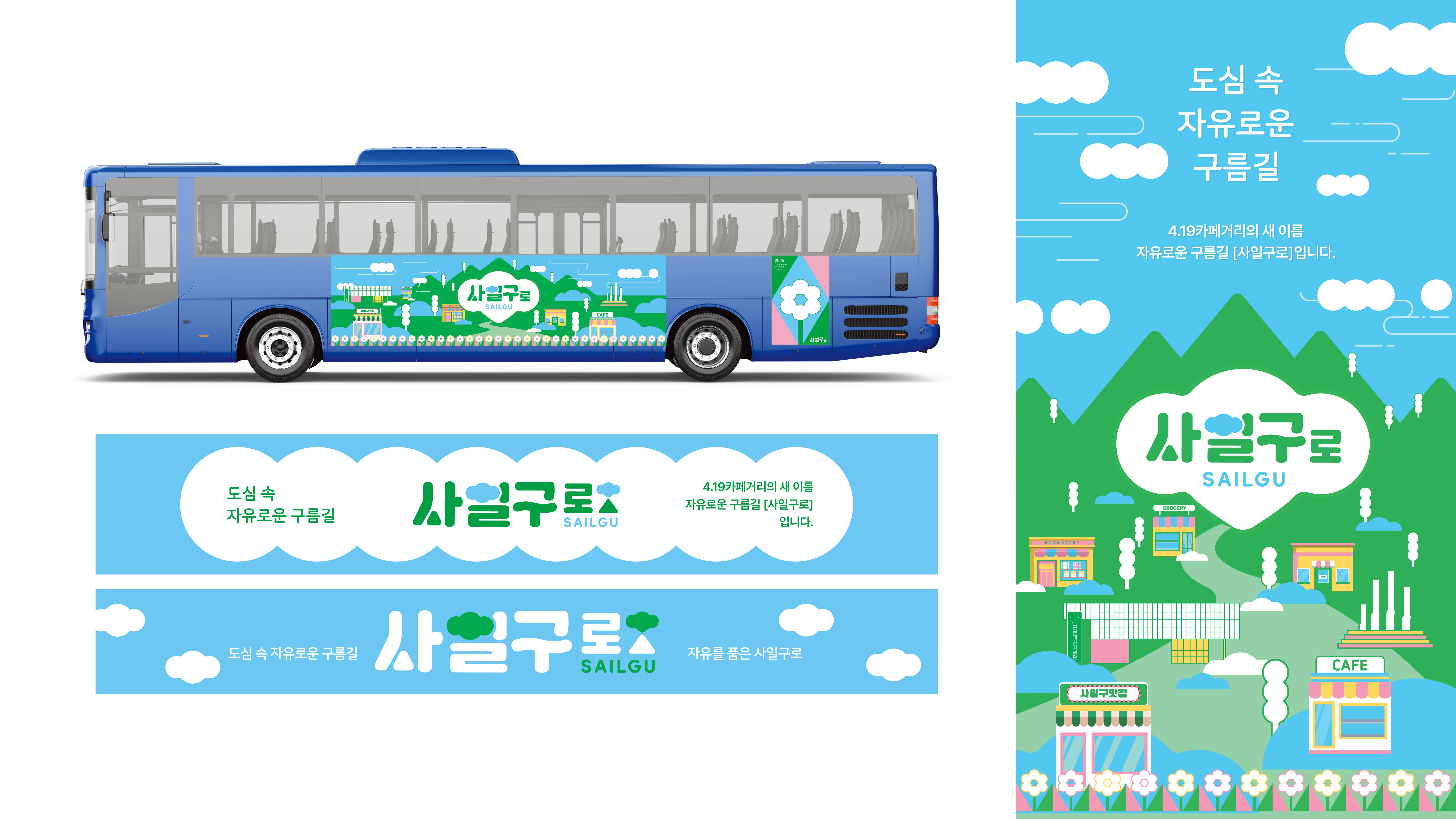 그리고 힐링버스 운영도 시작됐습니다. 이 상권을 다니는 유일한 버스 두 대에 사일구로 랩핑을 했거든요. 그냥 마을버스가 아니라 '사일구로 전용 셔틀버스' 느낌으로 변신한 거죠.