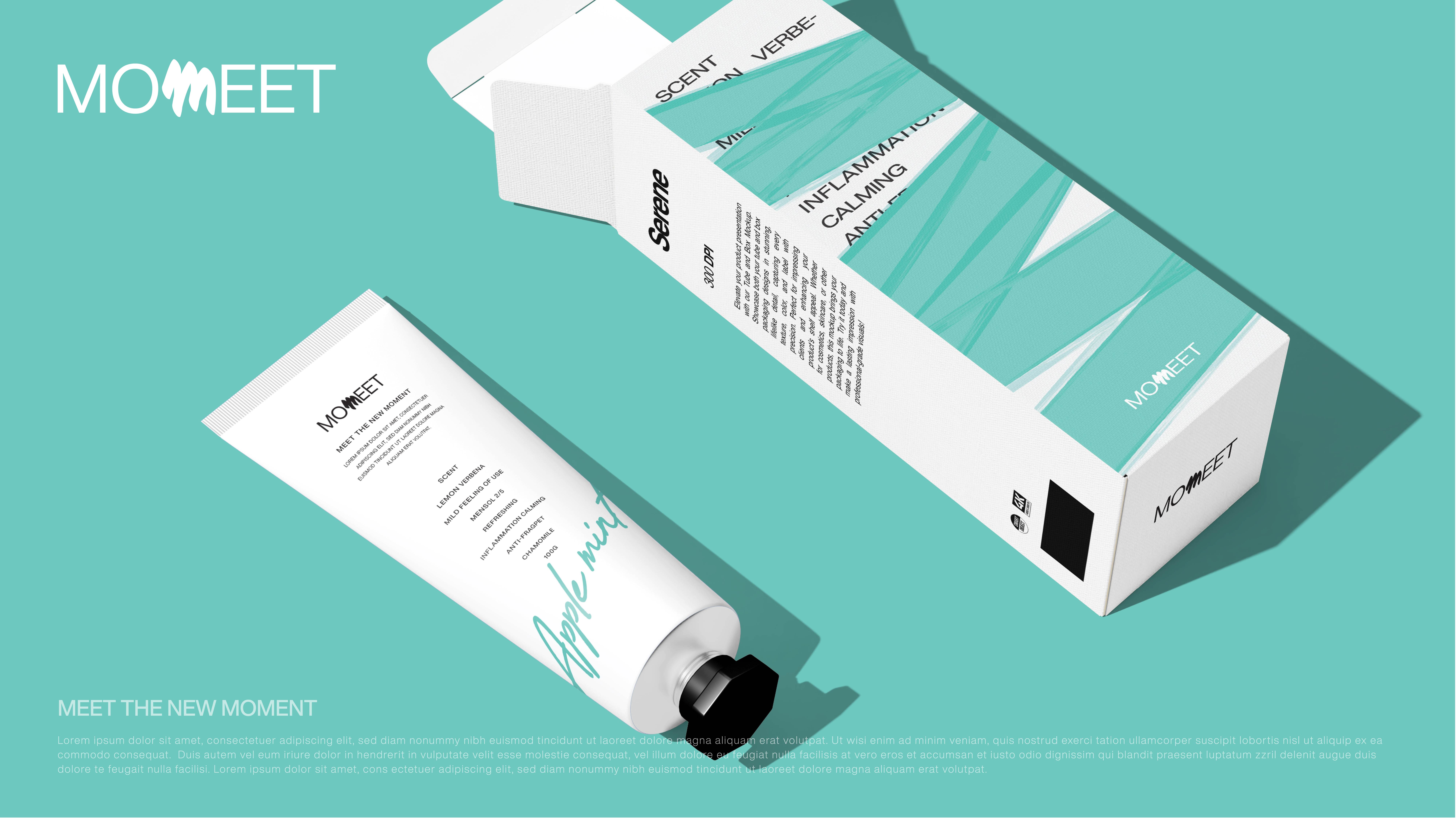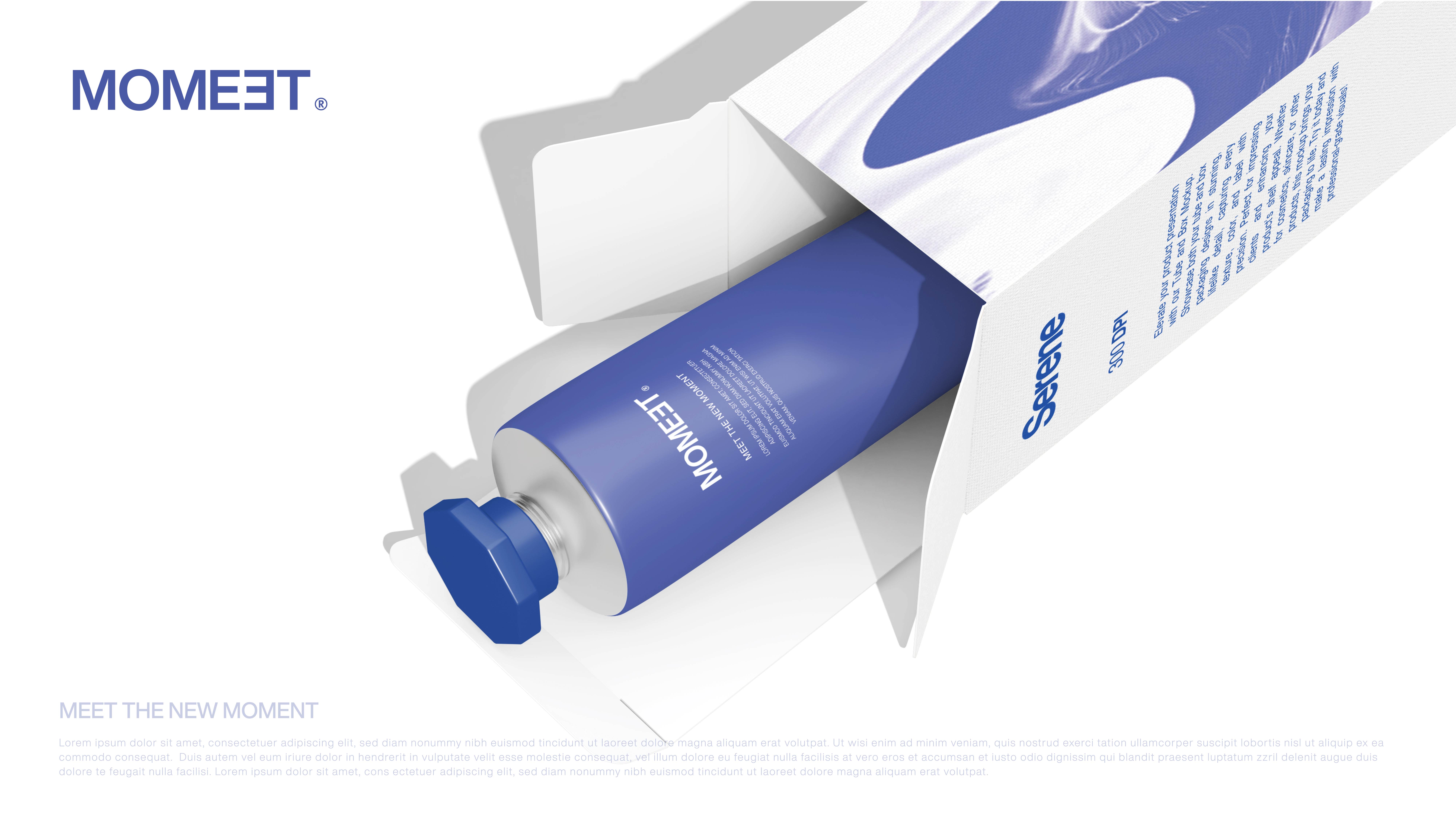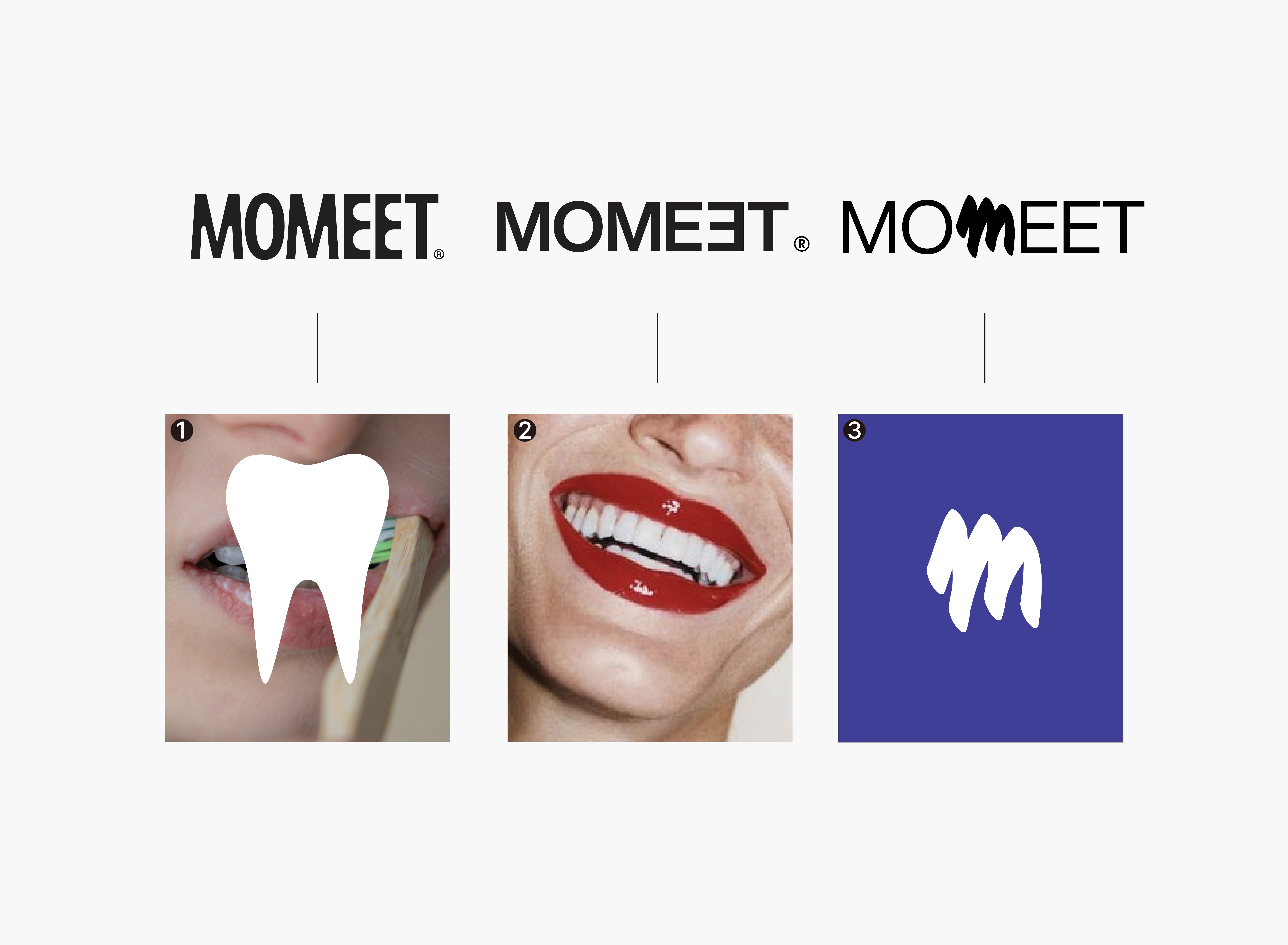 시안 02는 로고 자체에 스토리텔링을 담았어요. 'MOMEET'의 두 번째 'E'를 좌우 반전시켜 만나다(Meet)의 의미를 시각적으로 표현했죠. 키 비주얼은 마블링 기법을 활용해, 치약과 물이라는 서로 다른 요소가 자연스럽게 섞이는 과정을 표현했어요.